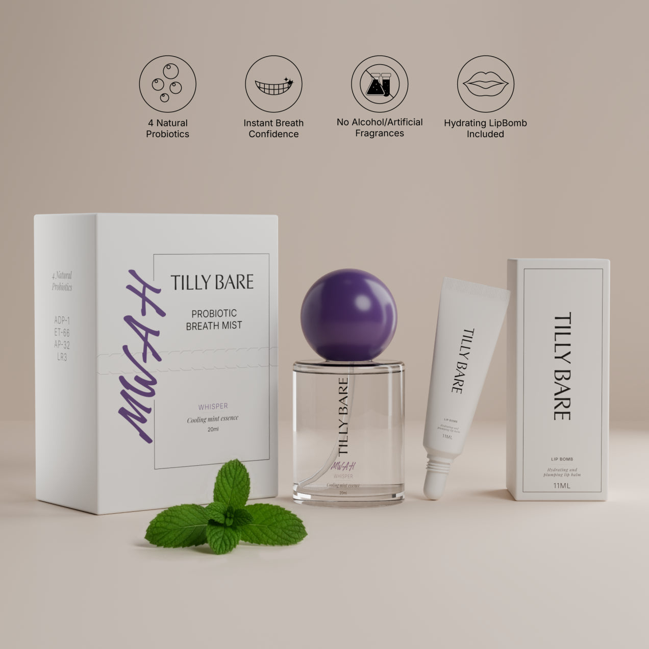 MWAH™ is a probiotic breath mist made with 4 natural probiotics, designed to refresh in seconds without the sting of alcohol or the heaviness of artificial fragrance. Finished with an included Hydrating LipBomb for effortless, elevated touch-ups.